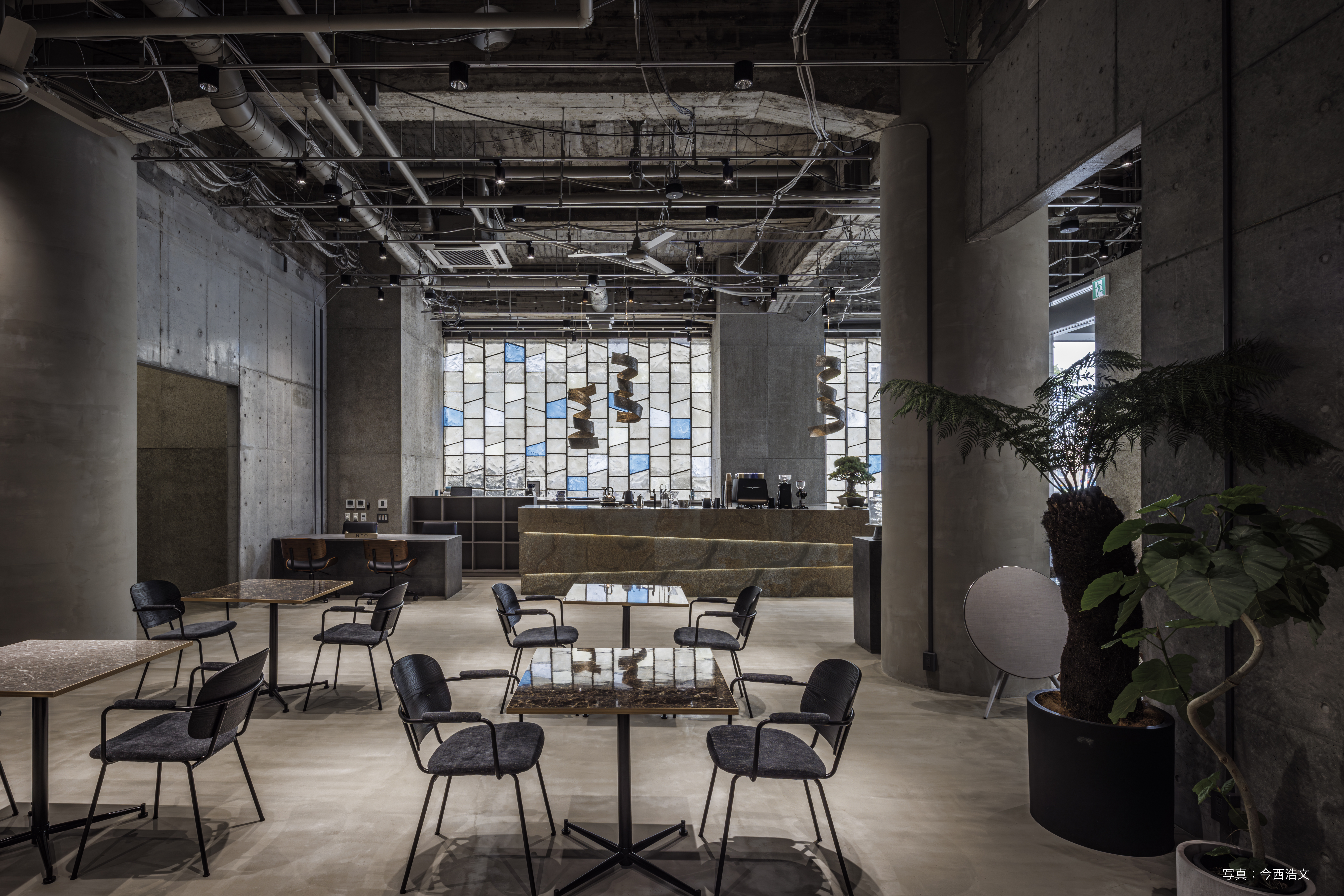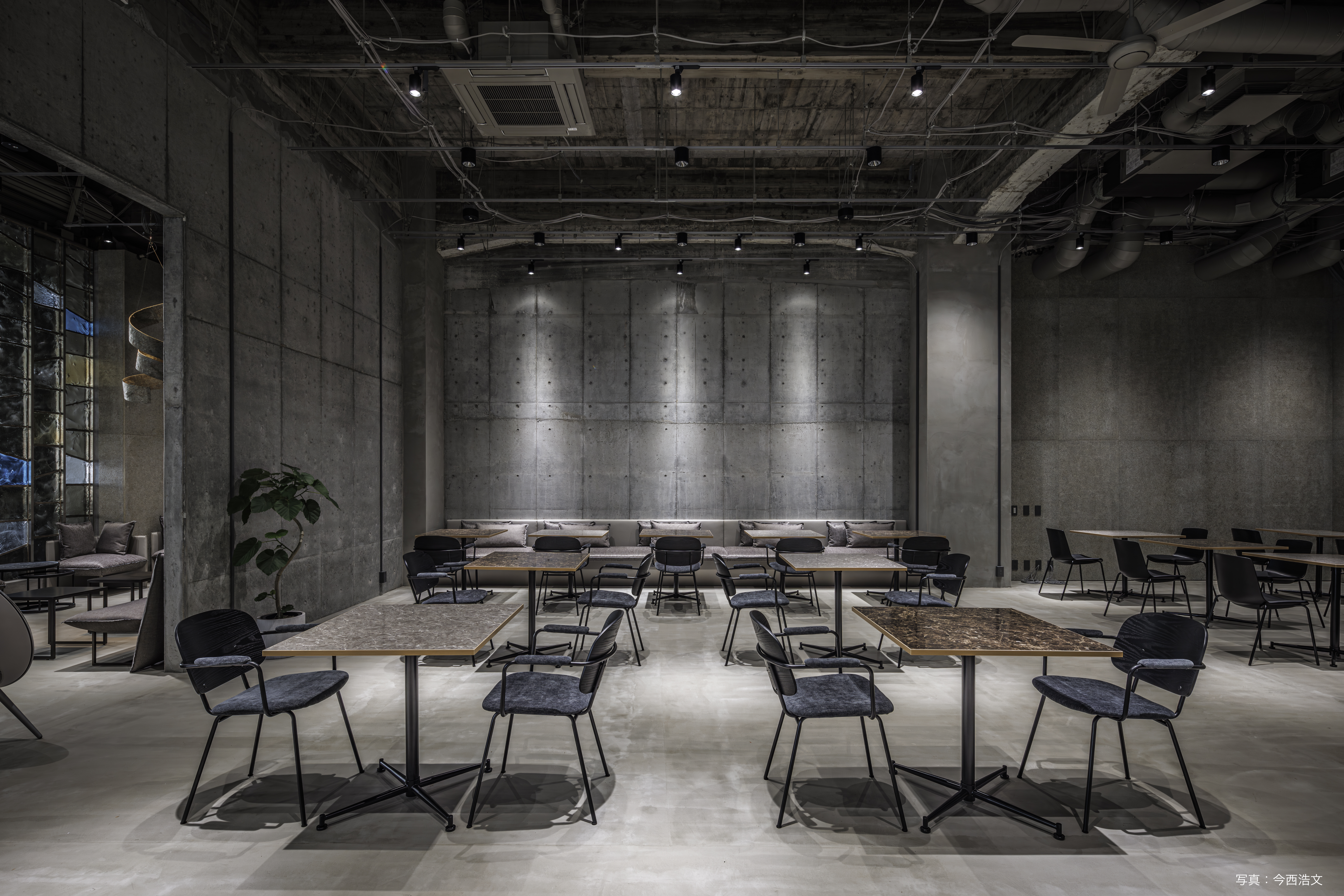 コンクリート打ち放しのモダンな空間に、石目調のテーブル。コワーキングエリアには電源と高速Wi-Fiを完備しています。程よい静けさが漂っており、驚くほど集中できます。